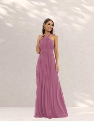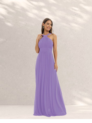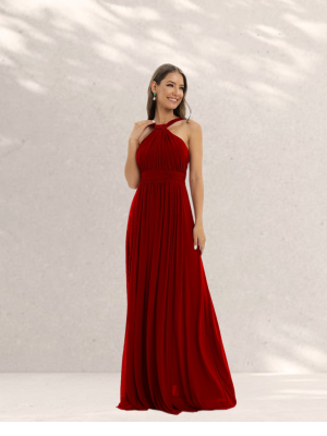 Vestido largo de cuello halter y aplicación de bolitas decorativas, la tejido suave y elástico se amolda muy bien al cuerpo.
