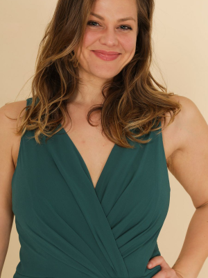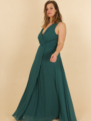 Vestido largo de gasa de talla grande, con mucho vuelo y abertura en la pierna. Escote pico y ligero fruncido en el pecho, de talle alto para estilizar más la figura. Ideal para complementar con un cinturón de flores o rígido.