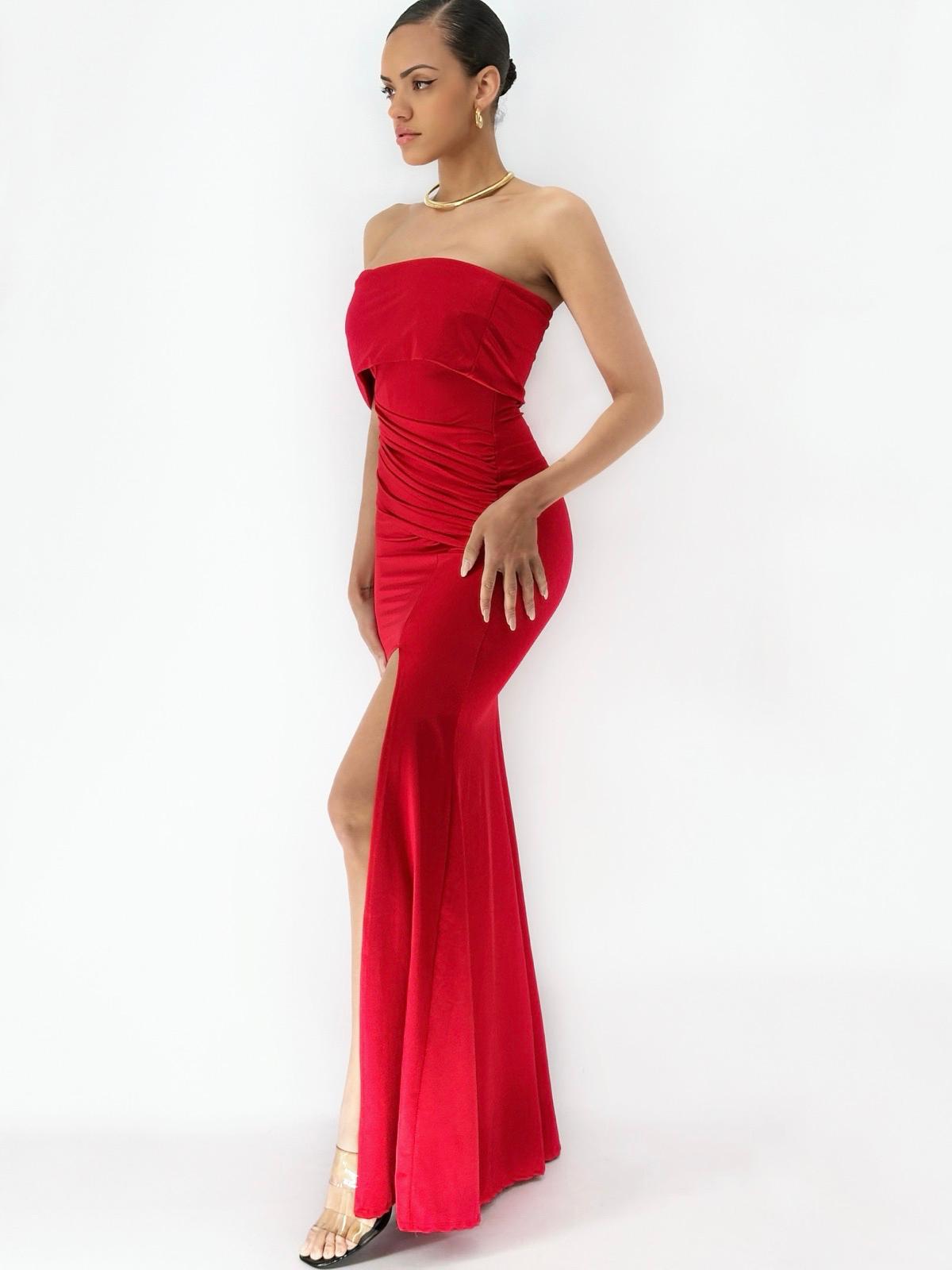 Vestido largo de corte sirena con escote tipo barco y asimétrico de un tirante. Presenta drapeado en la parte frontal de la cadera con abertura lateral. Fabricado con tejido satinado ligeramente elástico.
