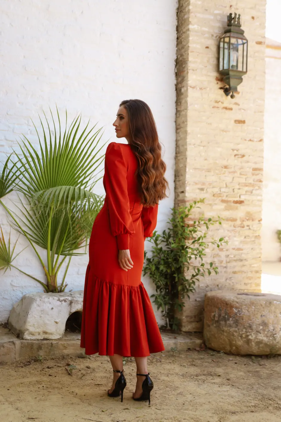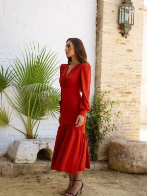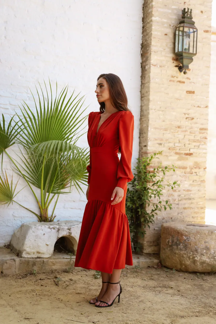 VESTIDO MIDI ESCOTE CRUZADO FRUNCES BAJO
